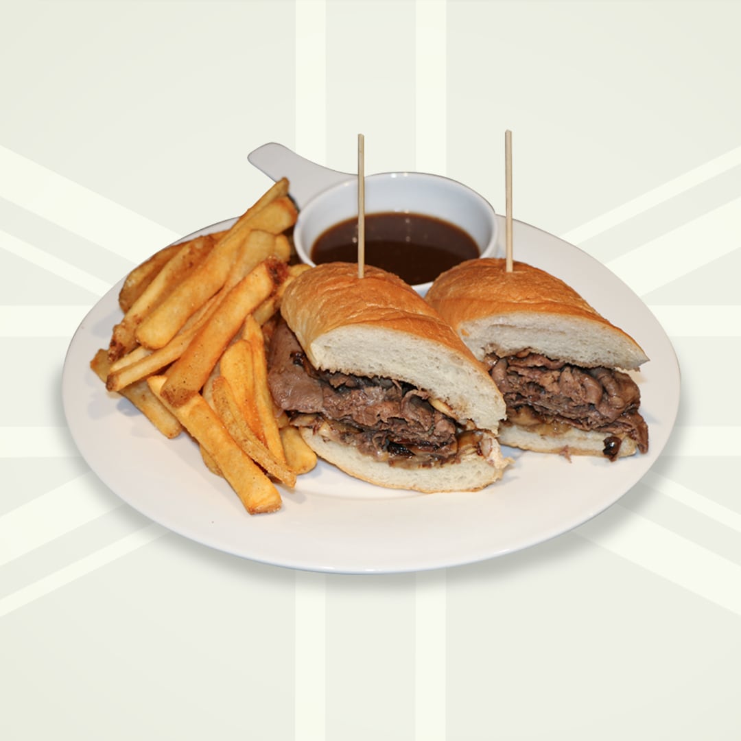 slow roasted beef shaved thin on a toasted baguette with sauteéd mushrooms, onions, horseradish aioli & swiss cheese.