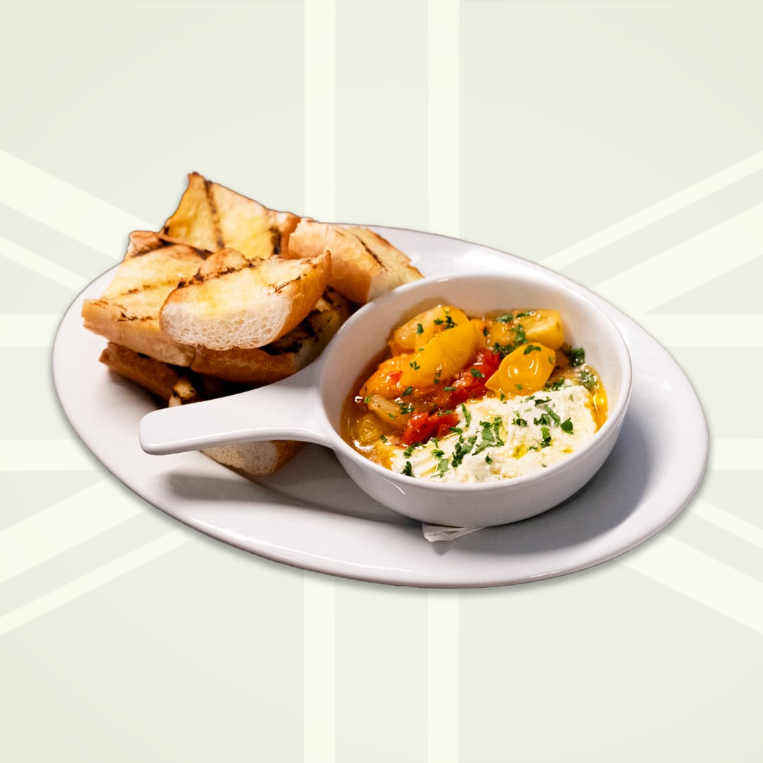 bite size tomatoes roasted with garlic & accompanied by whipped feta. served with grilled baguette slices.