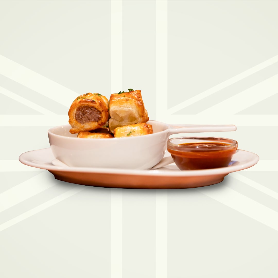 english banger meat wrapped in crispy puff pastry. served with curry ketchup.