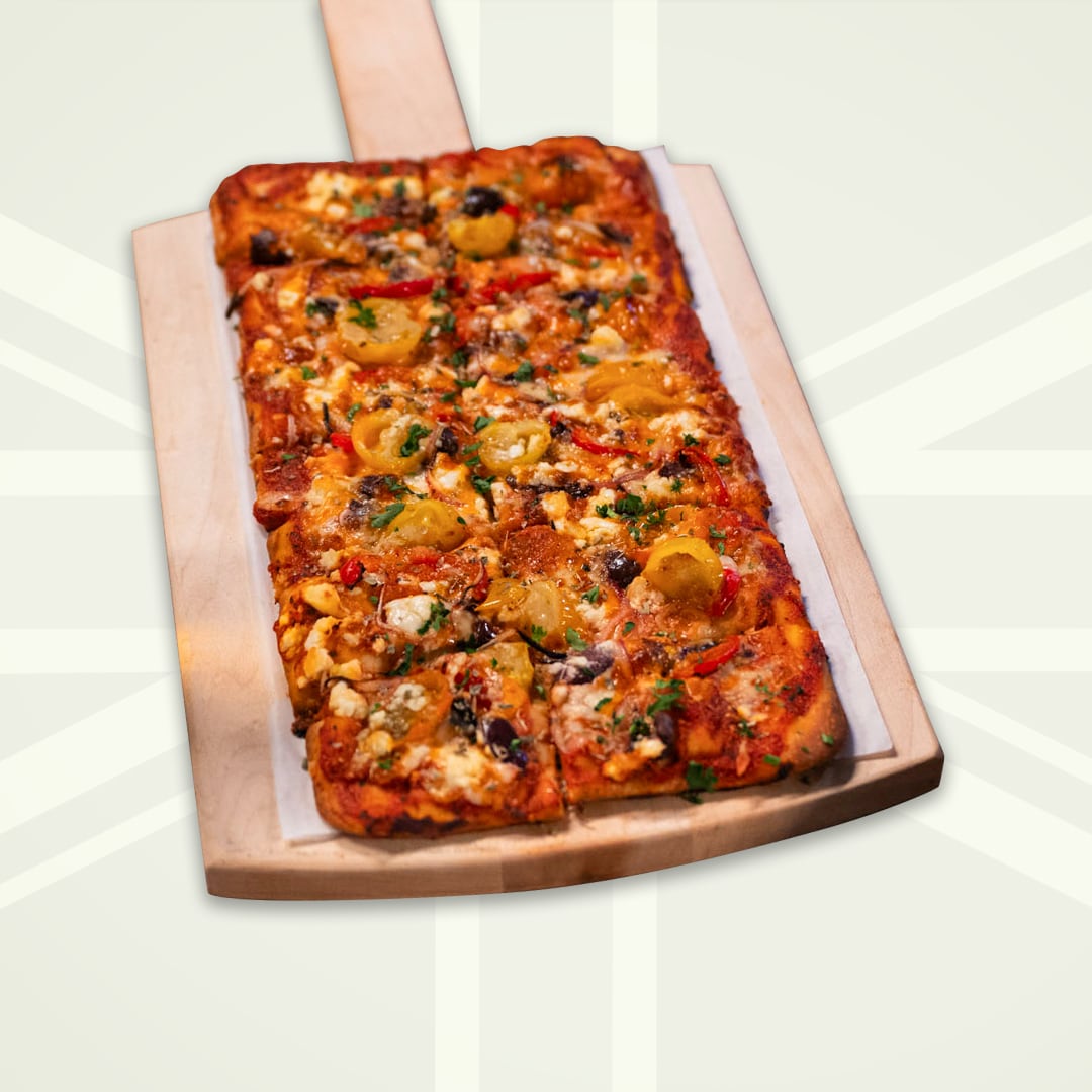 flatbread brushed with garlic butter & baked with tomato sauce, garlic marinated tomatoes, mixed cheese, feta, onion, red bell peppers & kalamata olives.