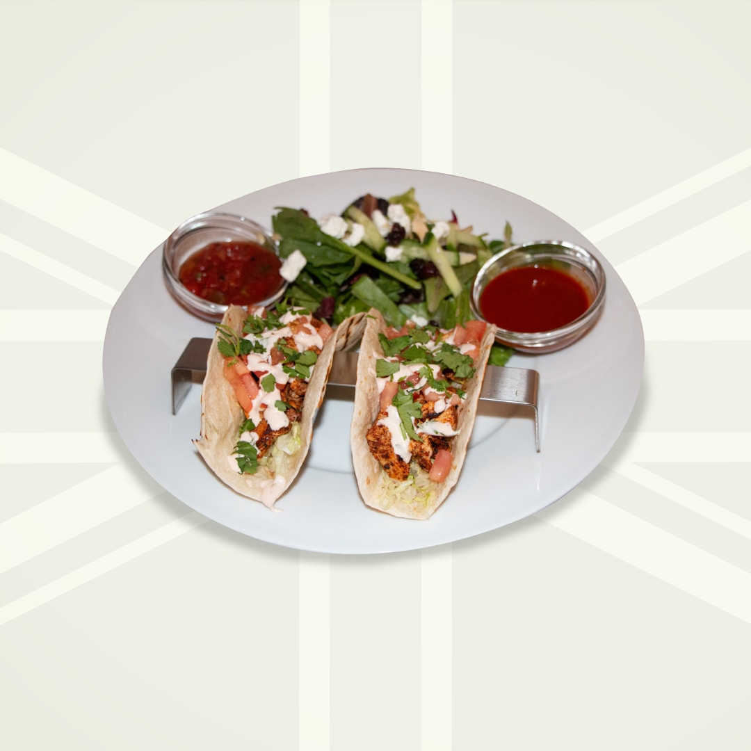 two crispy fried haddock tacos served in grilled flour tortillas with shredded cabbage, pico de gallo, chipotle aioli, cilantro & a side of hot sauce. served with a noble house salad.