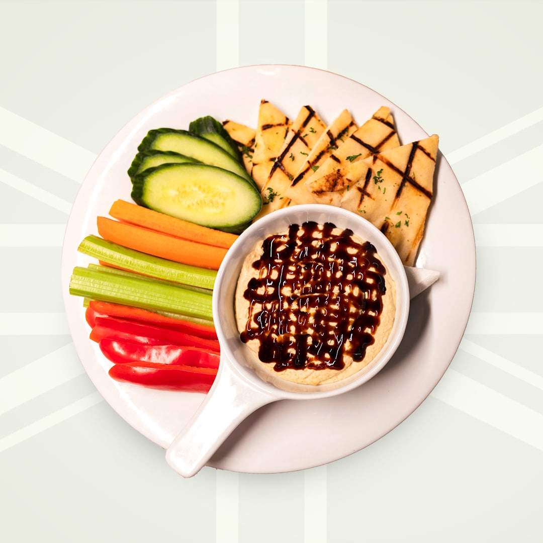 creamy hummus drizzled with a balsamic reduction & served with grilled garlic naan bread & veggies.
